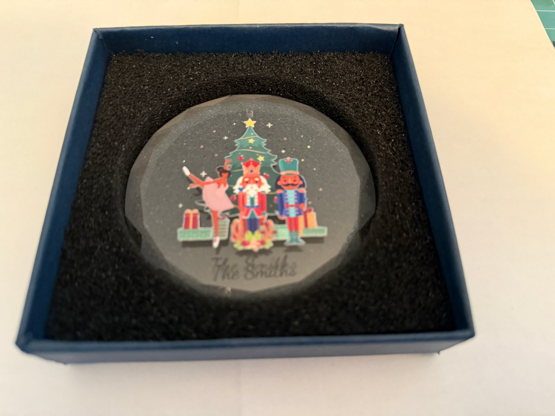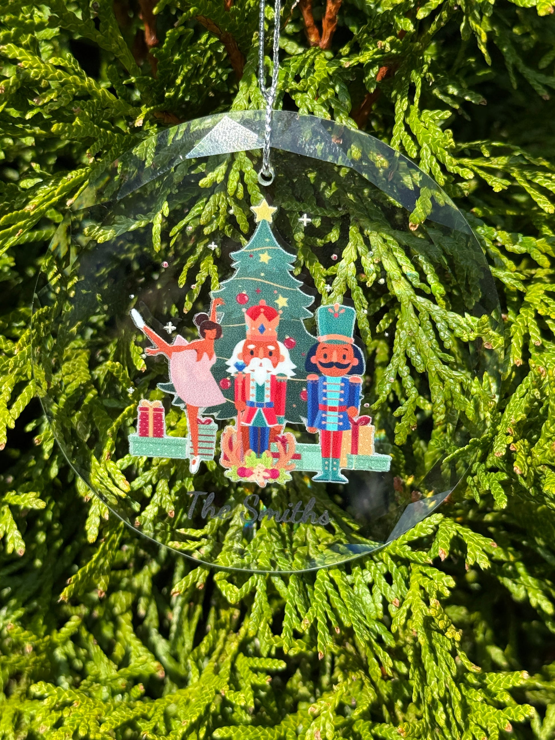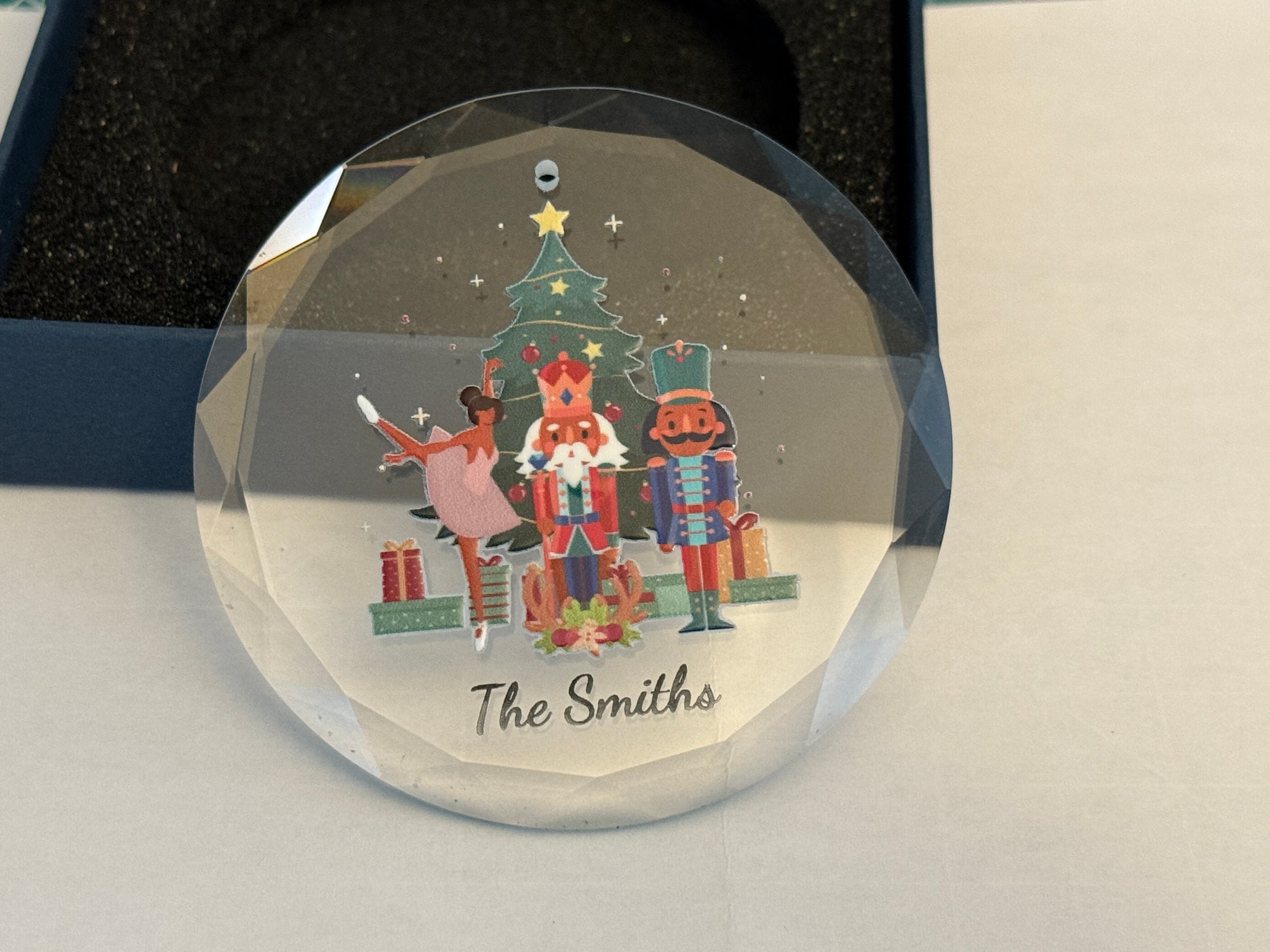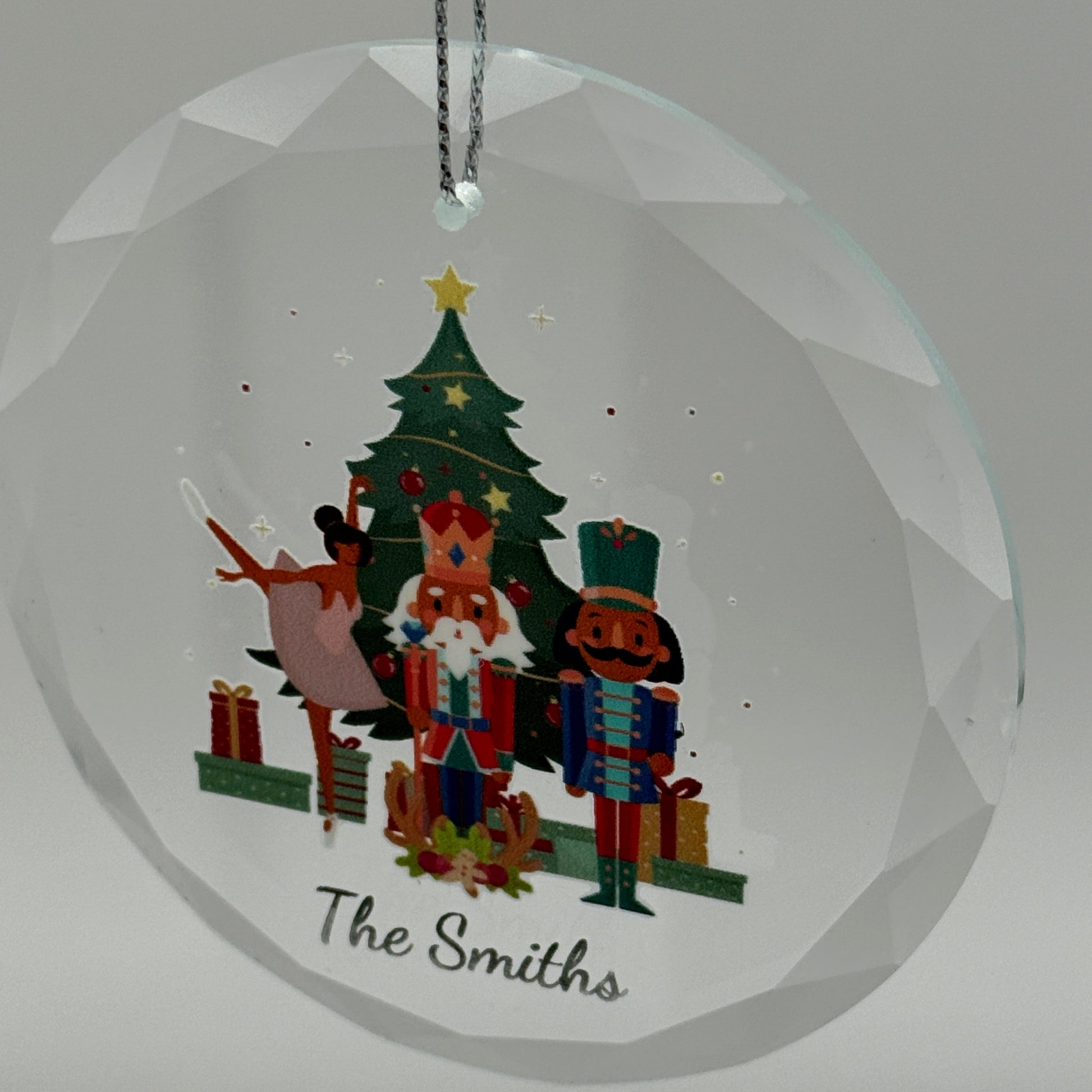 Celebrate the magic of the season with this beautifully crafted 3.25-inch round glass ornament featuring beveled edges that catch the light with elegance. The design showcases a festive Christmas tree surrounded by presents, a graceful brown-skinned ballerina, and two classic nutcrackers—capturing the joy and tradition of the holidays.