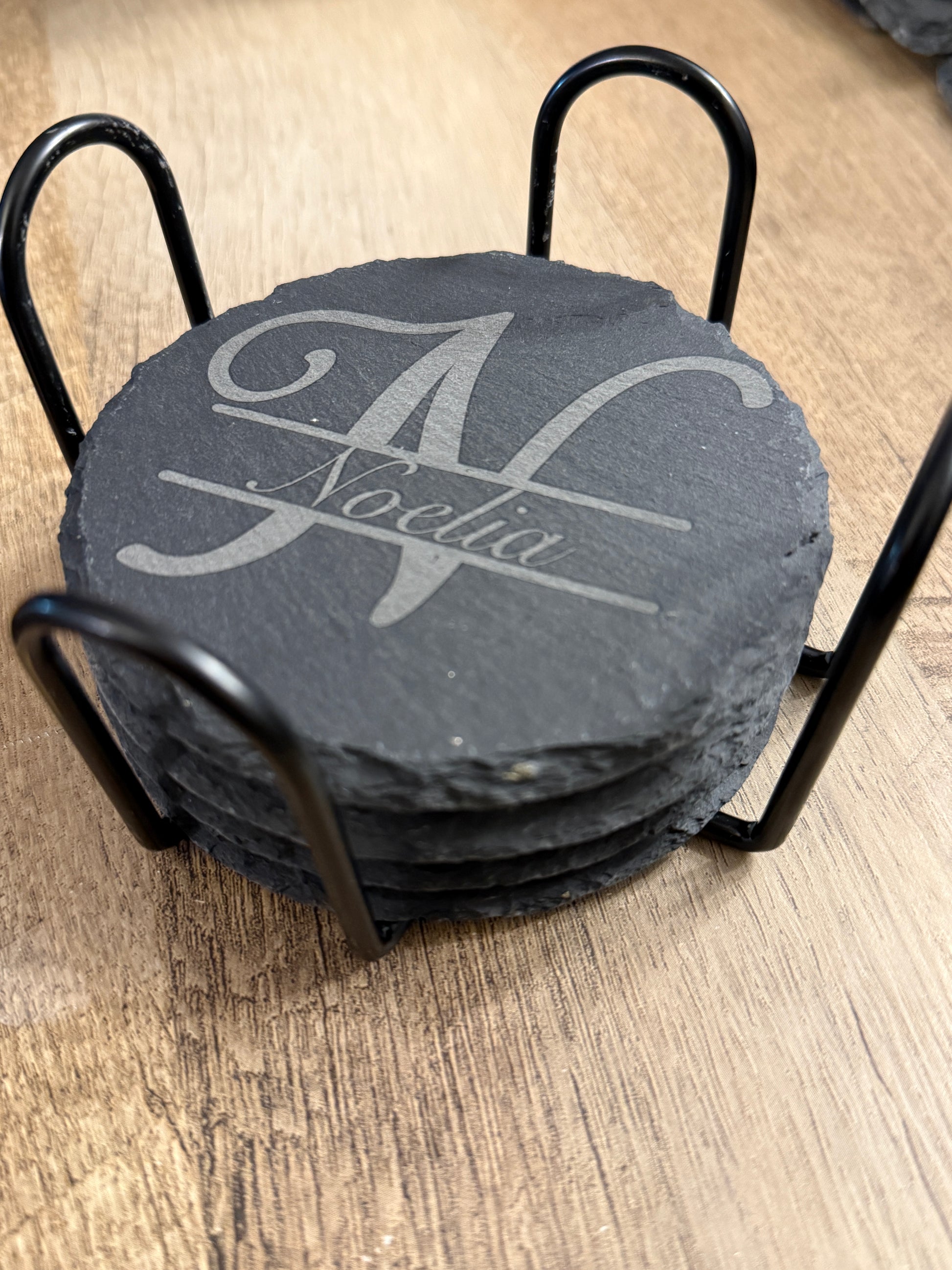 Each set includes four 4-inch round slate coasters, laser engraved with a stylish monogram initial and name of your choice. You can personalize all four coasters the same way or customize each one differently, making this set a thoughtful option for couples, families, weddings, housewarmings, or special occasions.
